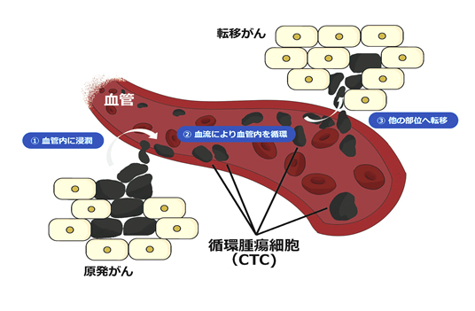 CTCは初期のがん部位から遊離したもので、血流に栄養や酸素を求めて血管内へ浸潤し、血液中を循環します。これが他の器官に移動し、そこで成長し始めると転移になります。なので転移のリスク管理としてCTCのモニタリングはとても重要です。